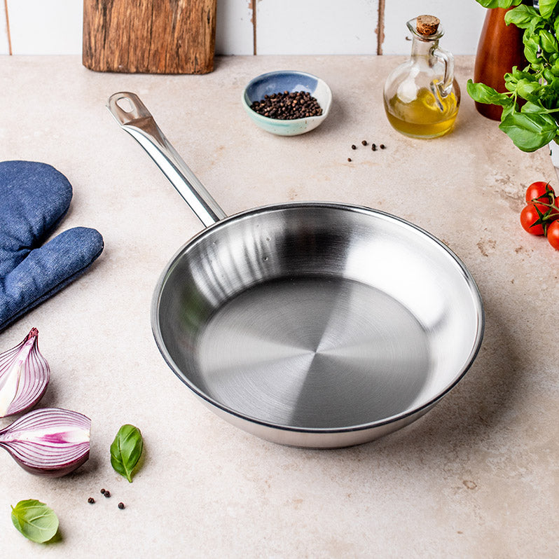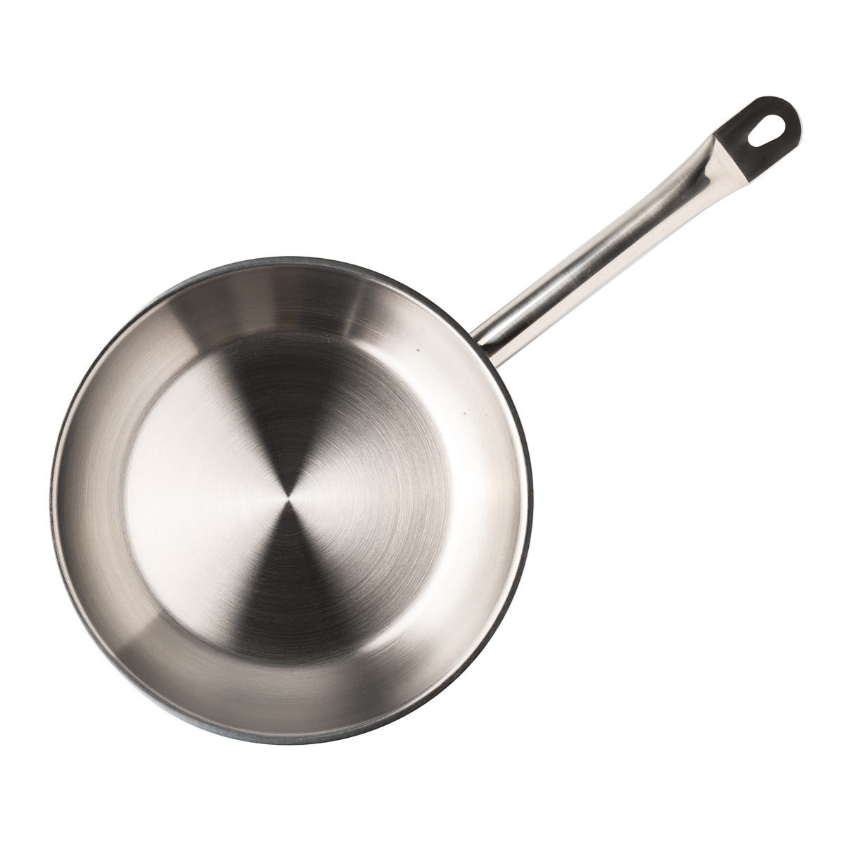 Wysokiej jakości, profesjonalna patelnia ze stali nierdzewnej charakteryzująca się dużą odpornością na uszkodzenia mechaniczne oraz odpornością na rdzę. Niezbędna patelnia dla każdego — zarówno amatora gotowania, jak i profesjonalisty. Dzięki tej patelni najszybciej zdobędziesz bezcenne umiejętności tworzenia smaków w swoich potrawach.